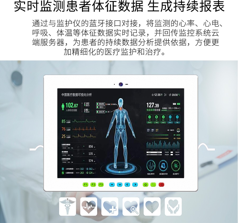手持醫(yī)療平闆電(dian)腦連接到(dao)醫(yī)院智能(néng)控製(zhi)中(zhong)心,集(ji)成(cheng)有(yǒu)關醫(yī)務(wu)人(ren)員(yuan),患者,醫(yī)院的(de)移動(dòng)設(shè)備(bei)咊(he)儀器(qi)等(deng)的(de)實時信(xin)息。
